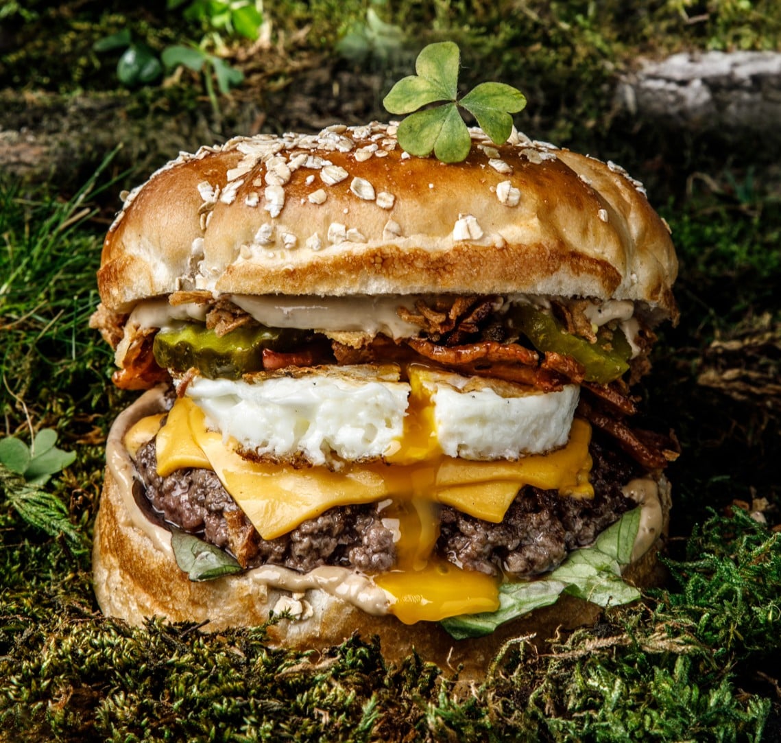 Il est composé d' un bun parsemé de flocons d' avoine de la Boulangerie HONORIN, d' un steak haché farci au cheddar, d' un œuf au plat de la ferme Etoilienne " Les Prés du Soleil ", de lard mariné à la sauce barbecue, d' oignons frits, de pickles de cornichons, de salade et d' une sauce au poivre vert.