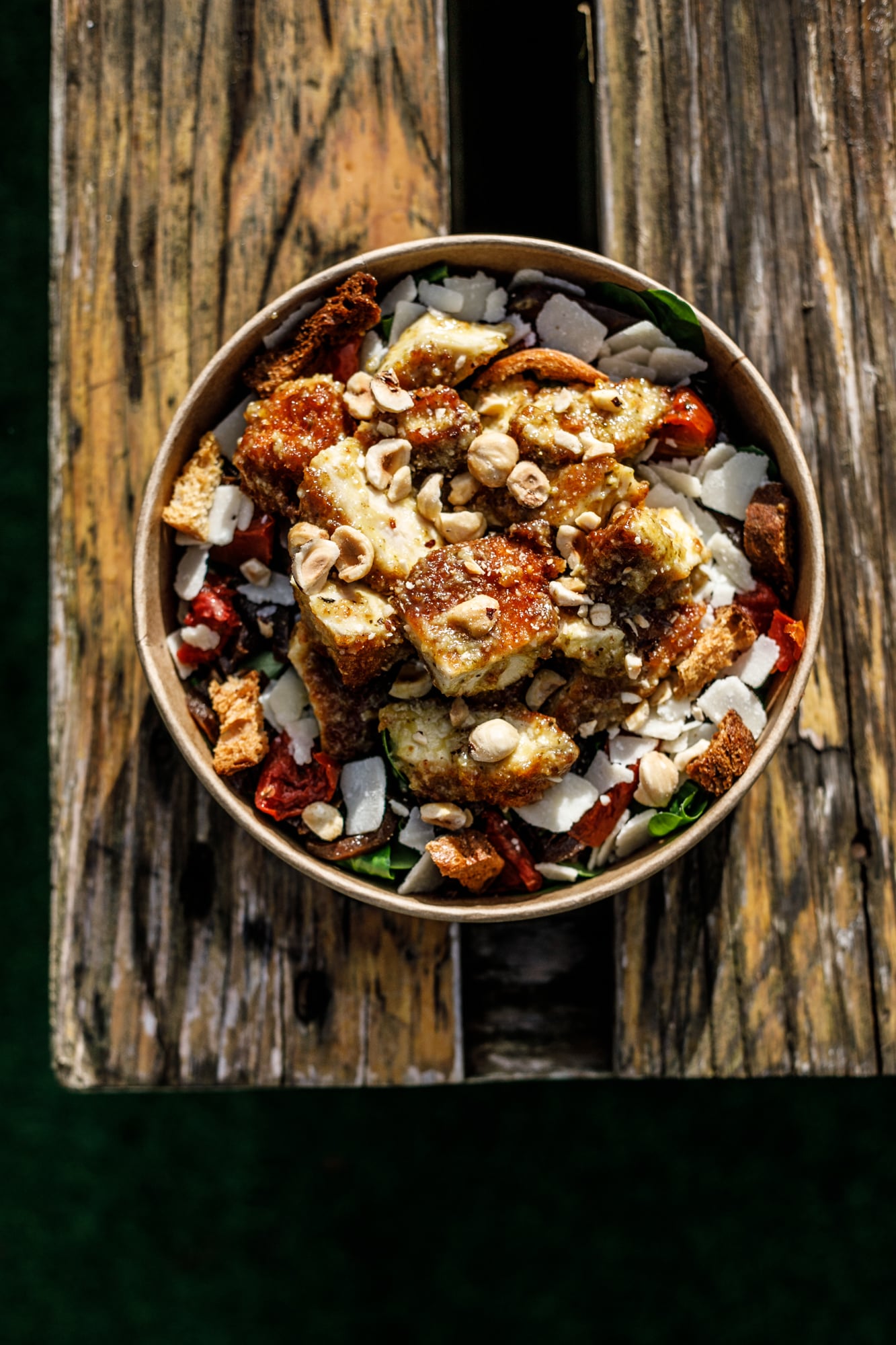 La salade Toscane est composée de mâche, copeaux de parmesan, tomates séchées, noisettes torréfiées, oignons confits au vinaigre balsamique, poulet mariné citron vert/ basilic et croûtons maison.