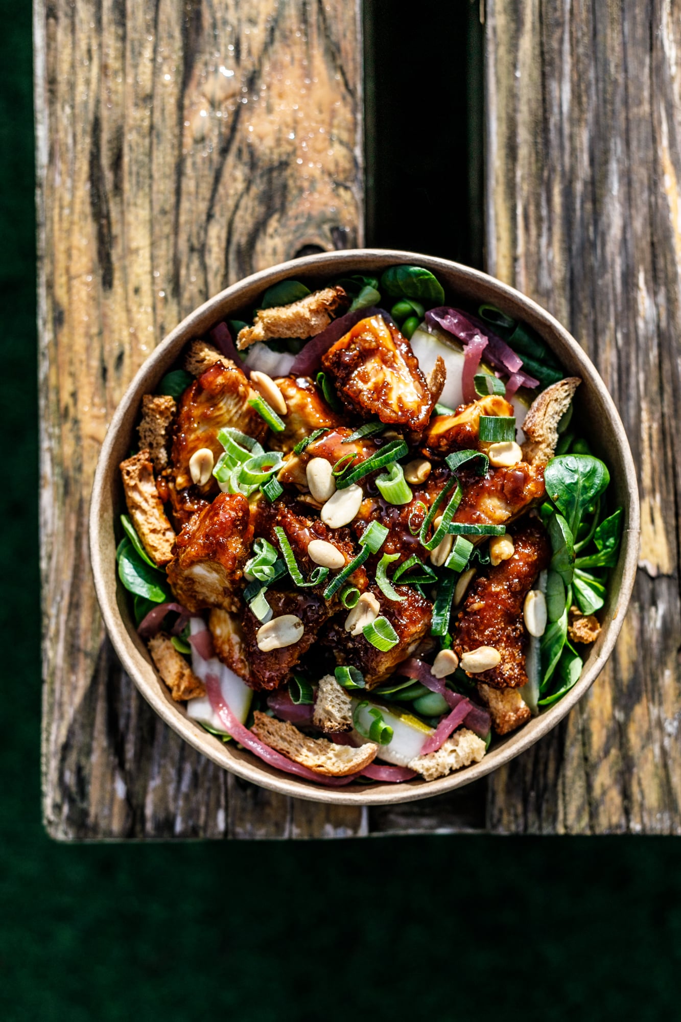 La salade nippone est composée de mâche, pickles d' oignons rouges et courgettes, fèves, cacahuètes, cébettes, poulet sauce yakitori et de croûtons maison.
