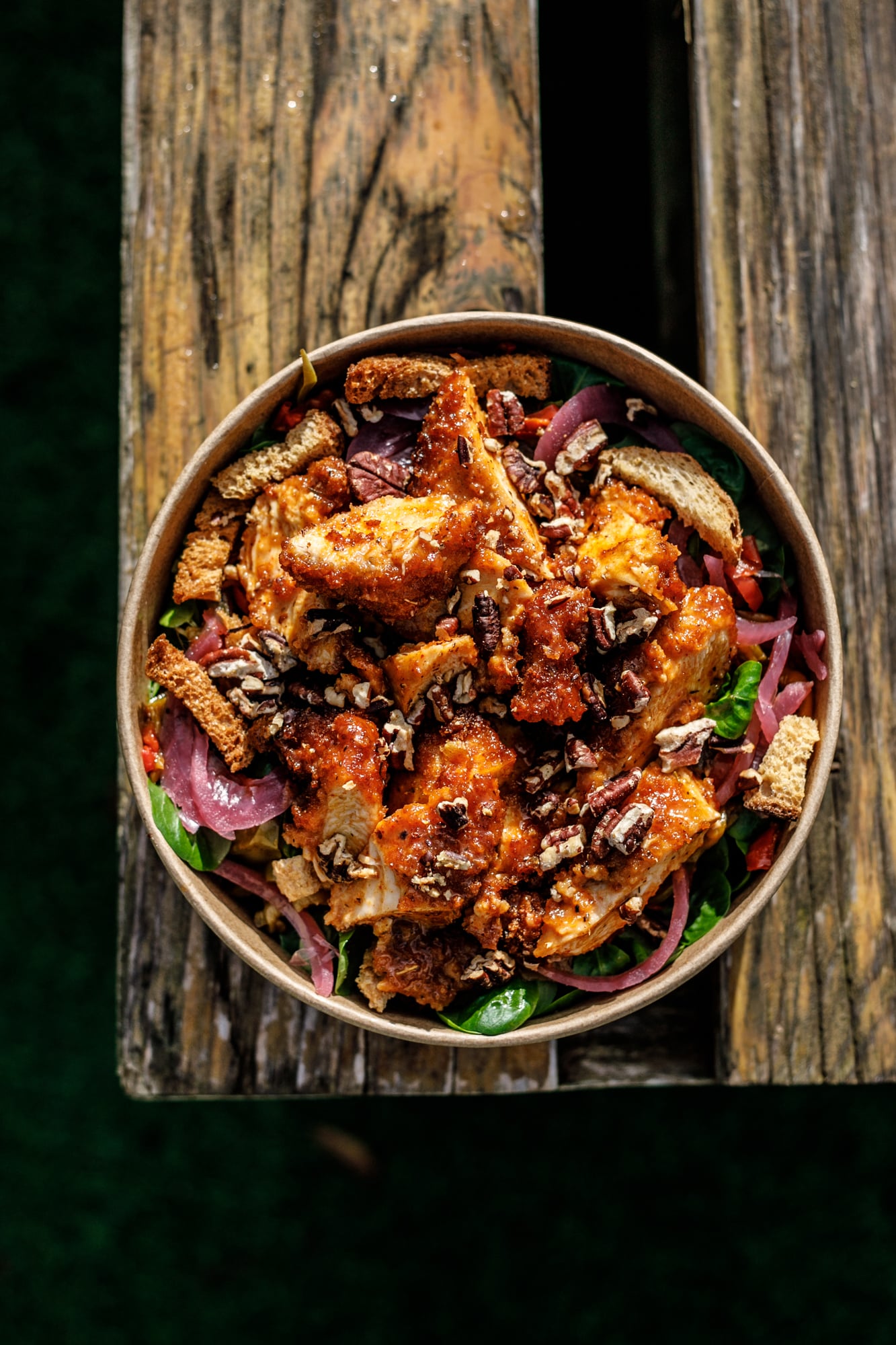 La salade Louisiane est composée de mâche, de poivrons, noix de pécan torréfiées, pickles d' oignons, poulet mariné épice Cajun et croûtons maison.